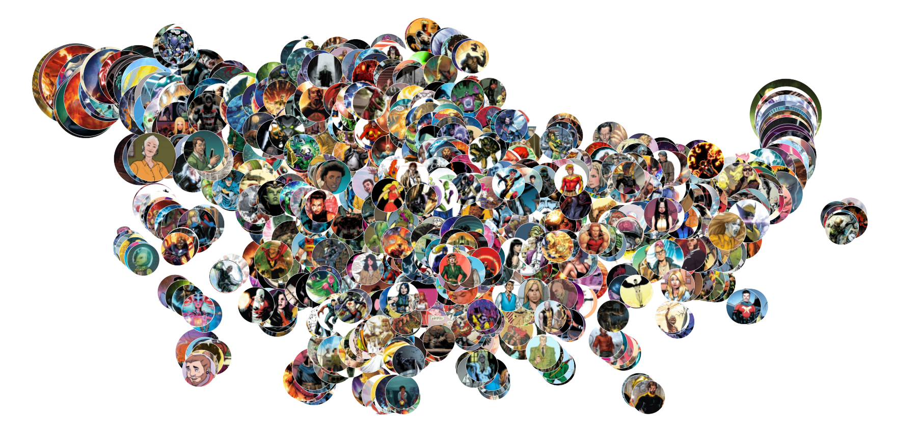 To compress our high-dimensional data for a flat, 2-dimensional visualization, we leverage a t-distributed stochastic neighbor embedding algorithm. This model is capable of considering the appearance counts of every pair and computing the most fitting coordinates (x, y) for each character. It also ensures that characters that were ‘close’ to each other in the multi-dimensional space also end up near each other in the two-dimensional space. The relationship won’t be perfectly linear - characters with the highest joint comic book appearances may not necessarily be the closest characters the graph, as they may be ‘pulled away’ from one another through large amounts of joint appearances with others. But for the most part, distance in space in the graph equates to extent of similarity in terms of the wholistic, multi-dimensional view. This is why The Avengers mostly cluster together, the X-Men mostly cluster together, and so on and so forth.